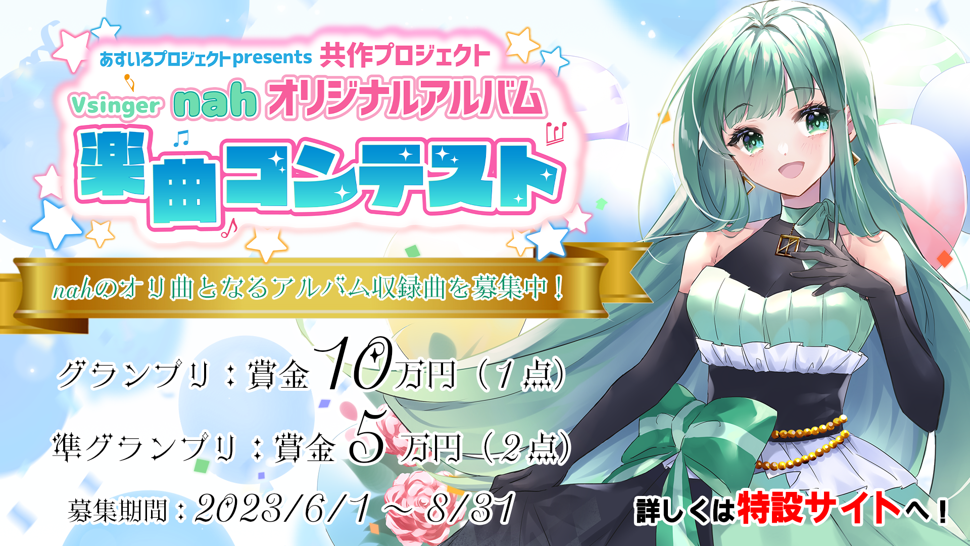 個人 Vtuber グループ・あすいろプロジェクトは、所属する Vsinger・nah(なー)のアルバム制作プロジェクトの一環として「オリジナルアルバム楽曲コンテスト」を開催し、収録曲を募集することを発表した。