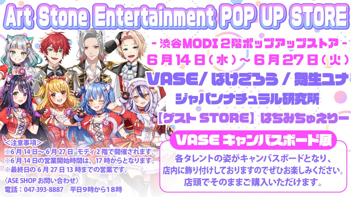 株式会社Art Stone Entertainment(本社:千葉県松戸市 代表取締役:板倉節子)が、2023年6月14日(水)より、所属タレント「ばけごろう」「バーチャルライバーグループVASE(ヴェイス)」などの期間限定ポップアップストアを、渋谷MODI店にてオープンいたしました。