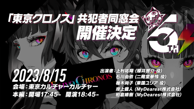 MyDearestは16日、VRアドベンチャーゲーム「東京クロノス」の4年ぶりとなるリアルイベント「共犯者同窓会」を8月15日に開催すると発表した。チケットは現地が6600円から、配信が4000円からで、本日19時より発売する。