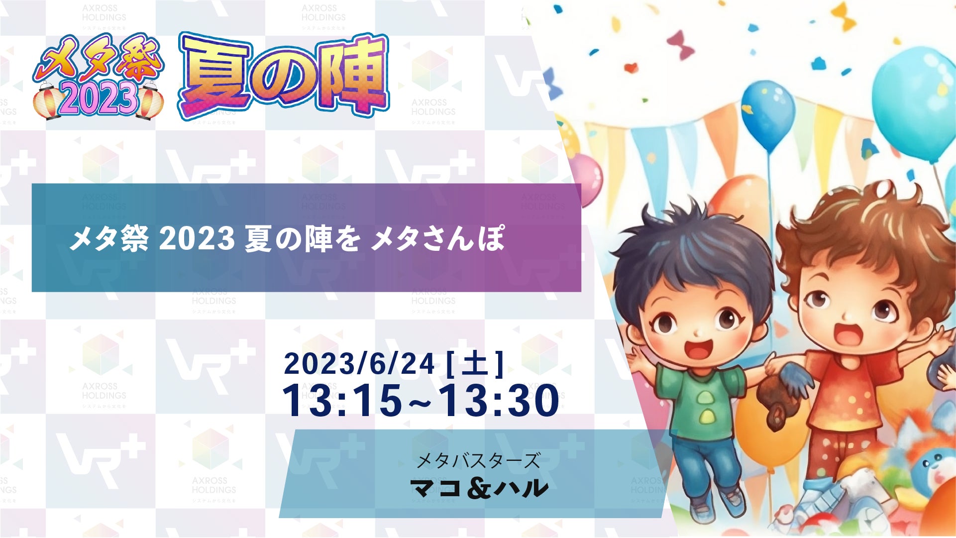 メタバースWeb3のコンテンツ企画・ディレクションを行うVma plus(ブイマプラス)株式会社(本社:東京都品川区、代表:津田徹)は、東京タワーとメタバース会場で同時開催するイベント「メタ祭2023夏の陣」のライブ配信コンテンツとしてメタバスターズの子どもたちと一緒に出展しているブースを回る「メタさんぽ」を配信することを発表します。