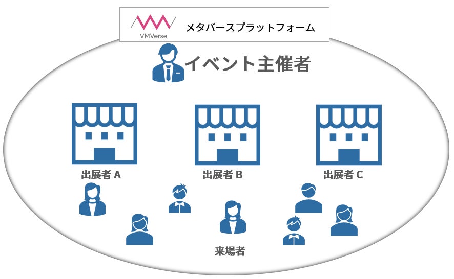 VMVerseはBtoBtoC向けメタバースプラットフォームとして主催者と来場者の2者間だけでなく、ショッピングモールの主催者、出品店舗、購入者や、イベントの主催者/出展社/来場者といった3者の管理機能を搭載しており、多様なビジネスで利用することができます。