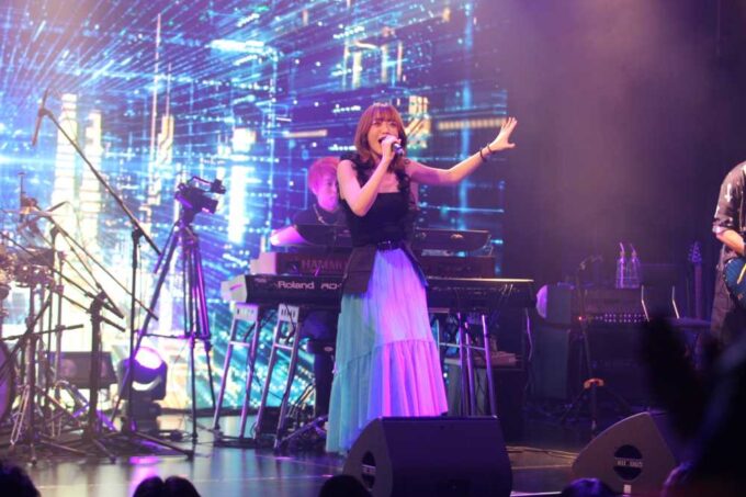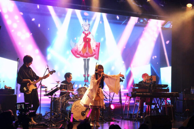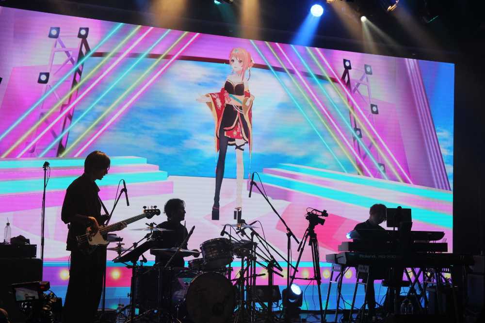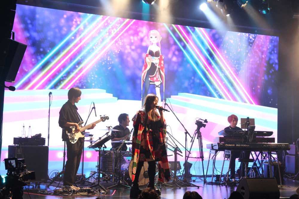 Vライバー最後の一人は、バーチャル戦国時代から来た戦乙女の紅咲るうさん。1曲目のボカロ曲「少女レイ」(初音ミク)では、柔らかくしっとりとした歌声に引き込まれたが、2曲目の人気アニソン「甲賀忍法帖」(陰陽座)では、曲調に合わせて歌声の華やかさも増したようだった。3曲目の「咲かせや咲かせ」(EGOIST)と、4曲目の「新時代」(Ado)も、それぞれに異なる曲調だが、紅咲さんの歌声の瑞々しさは、まったく失われない。激しい生バンドの演奏に負けない存在感も含めて、不思議な魅力のある歌声だった。