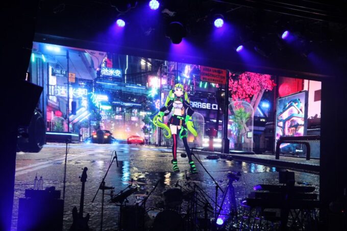 トップバッターとしてパフォーマンスを披露したのは、2087年のネオサイタマからやってきたVライバーのはいぴんぐモナカさん。ホバーカーが空を飛ぶ未来都市の道路の真ん中で、オリジナル曲Call Meを披露。自分の名前を連呼するパートが耳に残る「Call Me」は、一緒に活動していた兄が制作した楽曲。インタビューでは、その兄が昨年、ガンで亡くなった哀しみと共に、兄の曲で晴れ舞台のステージに立てた喜びも語った。