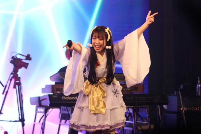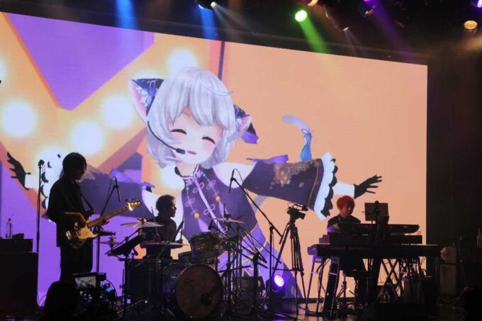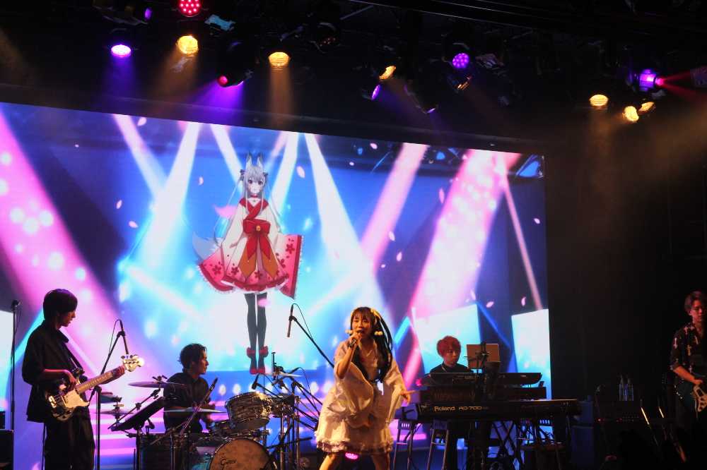 7人目は、銀髪キツネ耳で、モフモフ尻尾も可愛い神様見習いのVライバー御珠すずさん。ステージに登場する時、出囃子のように歌っていたオリジナルの「わんこちゃうぞ音頭」は、おしゃれなリズムとともに、かすかな電波感もあり、思わず口ずさみたくなる曲だった。その後は、「夜拙ディセイブ」(じん feat.IA)、「夜もすがら君想ふ」(初音ミク)、「Mela!」(緑黄色社会)の3曲をカバー。曲調の変化に合わせて、様々な歌声も変化させるだけでなく、和装以外にも2種類の衣装を披露。早着替えの得意なVライバーらしい華やかなステージだった。