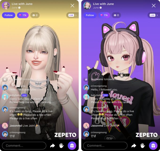 2022年1月にリリースし、日本/韓国/アメリカ/インドネシア/タイ/フランスの6ヵ国で提供している「ZEPETOライブ」機能を利用することで、VTuberのように2Dキャラクターの姿でライブ配信が可能だ。