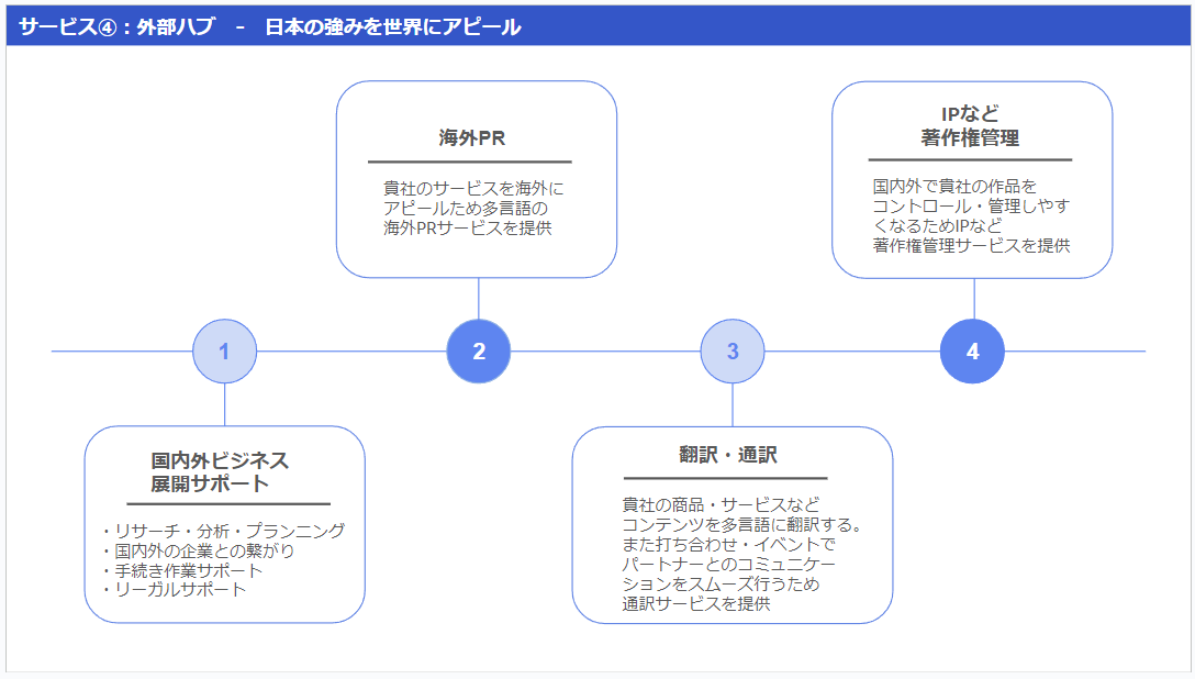 弊社では事前にリサーチ・分析を行い、海外企業との連携、海外PR、翻訳・通訳サービス、また著作権管理などのIPサービスを提供しております。