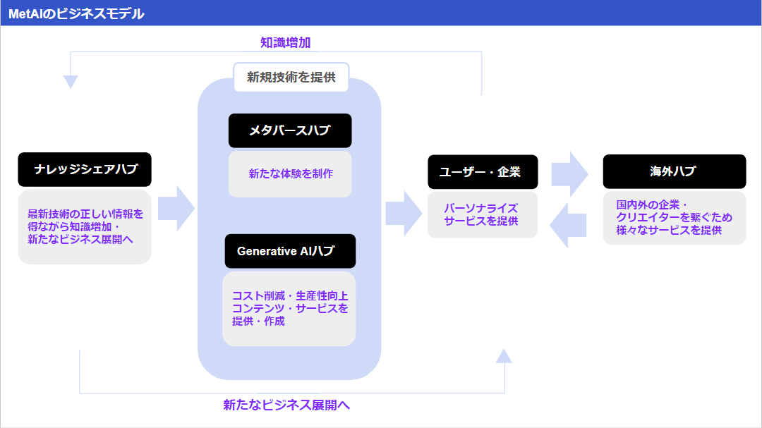 さらに、これらの新しいサービス・商品を受け入れたユーザーや企業は「あ!メタバース・AIでこんなことができるんだ!勘違いしていました!私も学びたい!」と感じ、弊社の「ナレッジシェアハブ」に足を運び、新規技術について学ぶというサイクリングビジネスを展開しています。