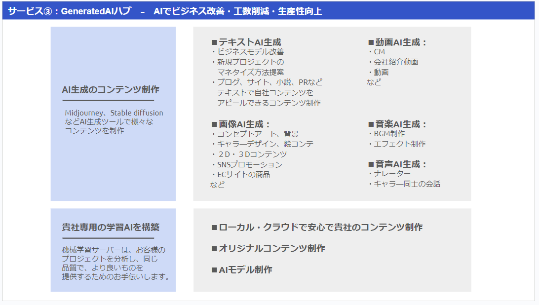 ジェネレーティブAIハブでは、AI生成コンテンツ制作(テキスト、画像、動画、音楽、音声など)が可能であり、またAI学習およびAIアドバイザーのサービスも提供しております。