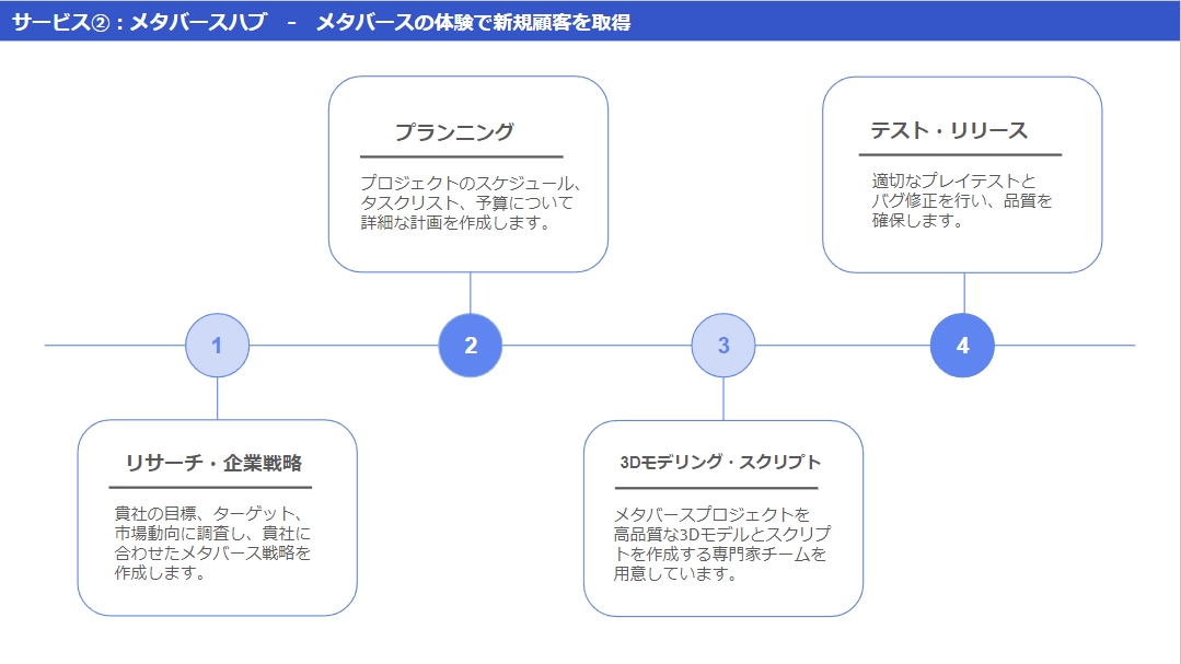 弊社は、メタバースやAIなどの新規技術に関するナレッジシェアサービスやメタバースプラットフォーム内での企業プロモーション・イベント制作、AI生成コンテンツ制作、AIアドバイザー・AI教師のサービスを提供しています。さらに、国内外ビジネス展開支援や海外PR、著作権管理サービスも提供しております。これらのサービスを4つのハブに分けてご提供しております。