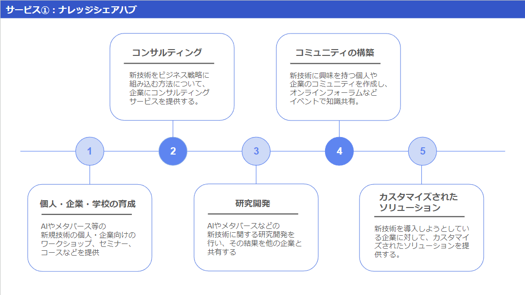 ナレッジシェアハブでは、個人・企業・学校向けにメタバース、AIなどの新規技術に関するナレッジシェアサービスを提供しております。さらに、コンサルティング、研究開発、コミュニティの構築などのサービスも行っております。