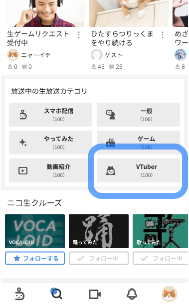 ③Androidアプリの検索マークをタップし、表示されるカテゴリに「VTuber」が追加されているのでボタンをタップする