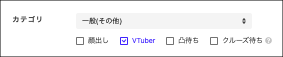 ①PCで配信を行う場合、カテゴリ欄にある「□ VTuber」にチェックを入れる。
