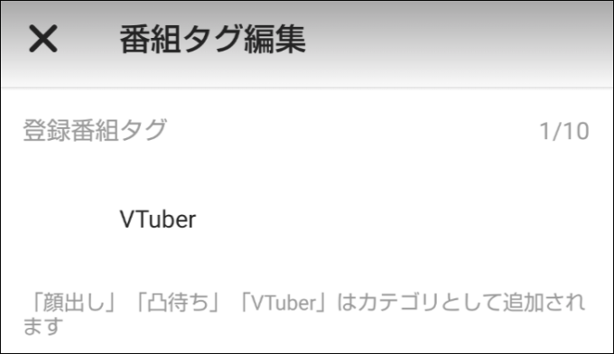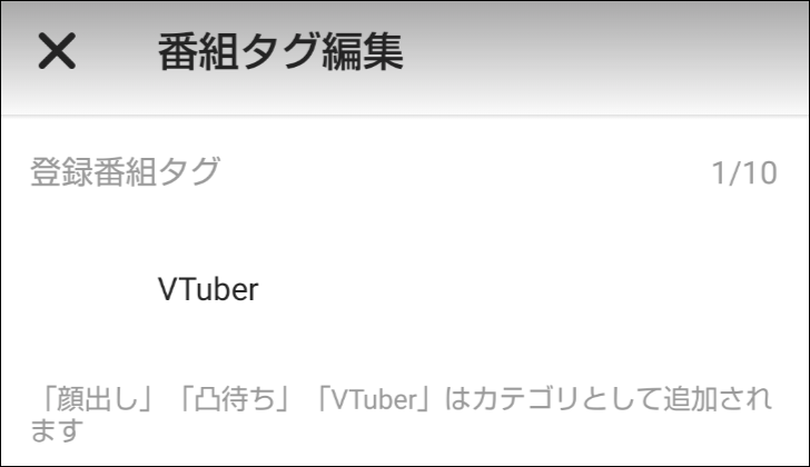 ②iOS/Androidアプリで配信を行う場合、番組作成時にタグに「VTuber」と入力。