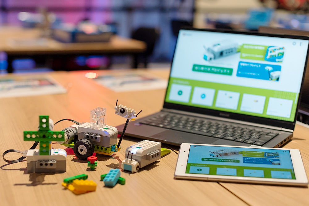 LEGOブロックを使い組み立てた作品をプログラミングで動かす体験ができます。