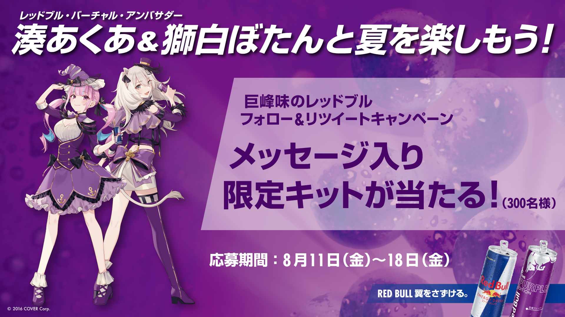 <湊あくあ&獅⽩ぼたんと夏を楽しもう!巨峰味のレッドブル フォロー&リツイートキャンペーン概要>