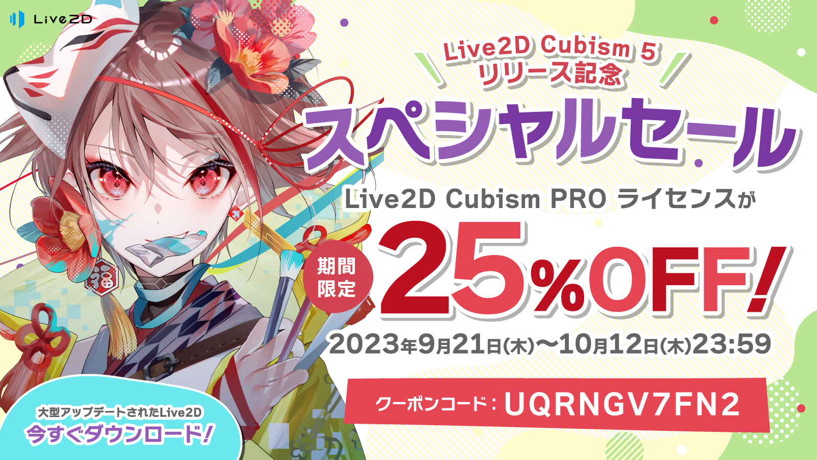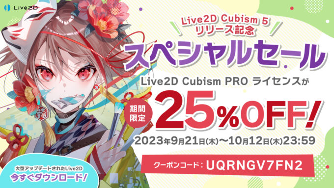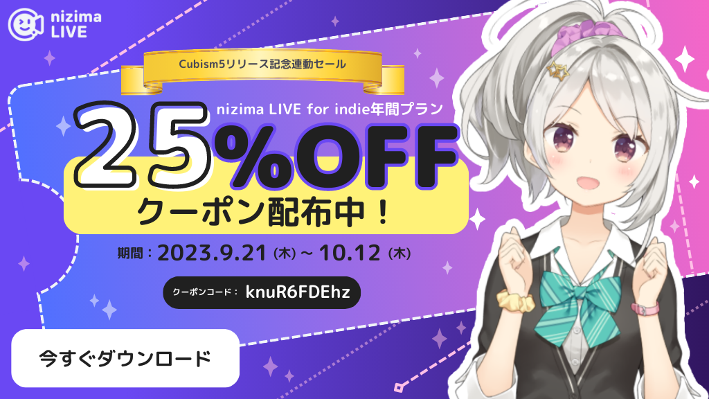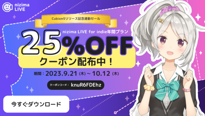 Cubism 5リリース連動として、9月21日~10月12日に「nizima LIVE for indie 年間プラン」が25%オフで購入できるクーポンコードも配布(詳細、クーポンコードの使い方)。