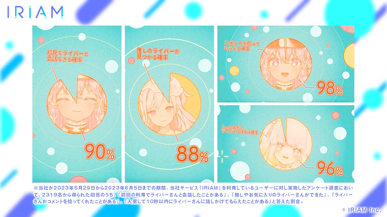 『IRIAM』は、そうしたVtuberの新しい在り方の一つとして、スマホひとつで簡単にキャラクターの姿で配信できる新感覚のライブ体験や、距離感の近いコミュニケーション、VtuberやVライバーと楽しくふれあえるギフトといったさまざまな「新感覚」を提供しています。今後もさらなるバーチャル市場の開拓に貢献していきますので、今後の『IRIAM』にご注目ください。