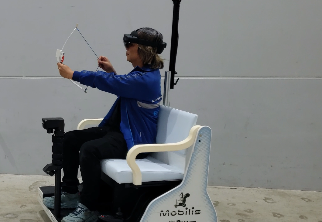 体験者は、単独自走式モビリティロボット「モビリス」に搭乗し、HoloLens 2を装着します。