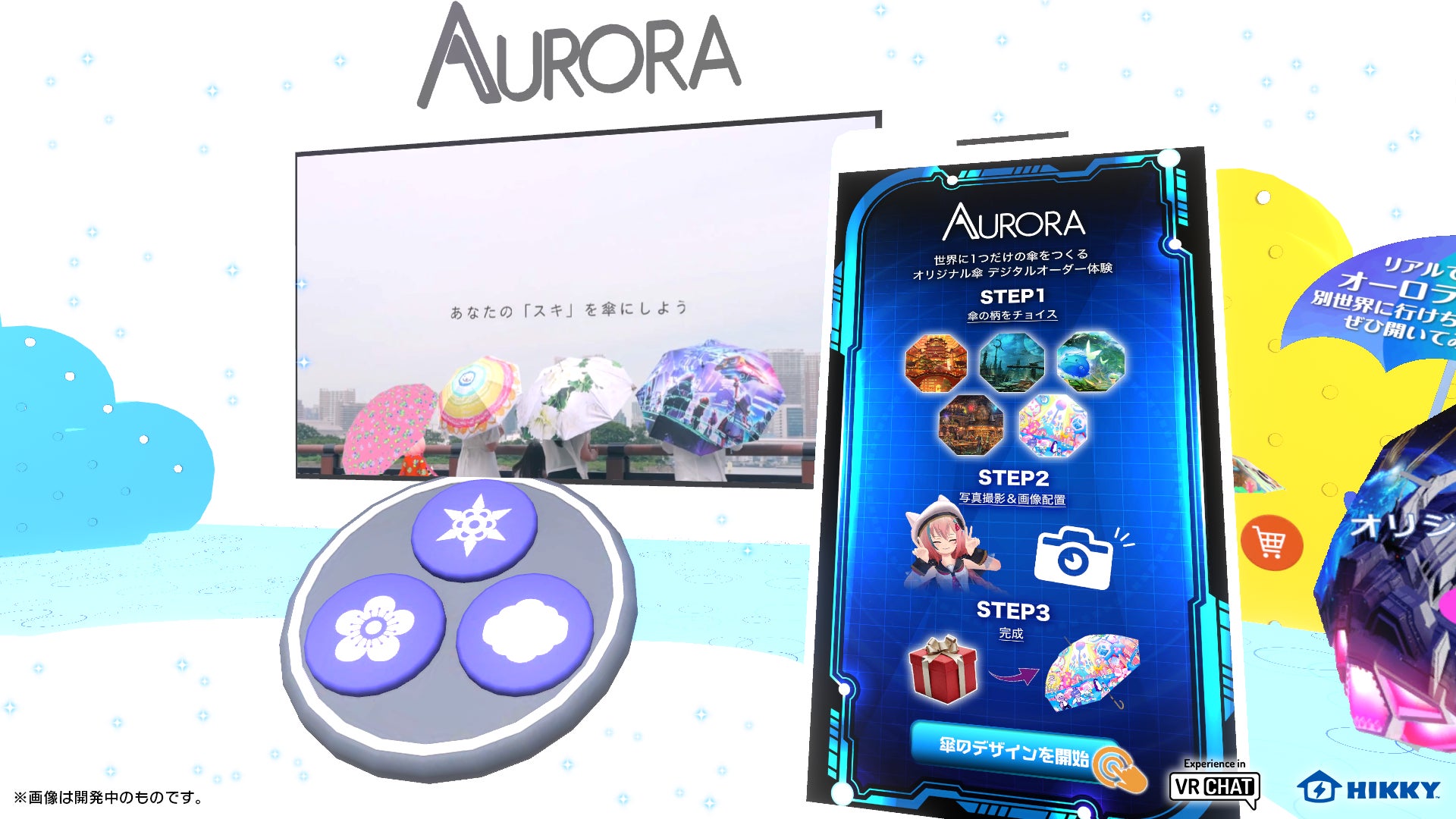 本イベントに、老舗傘メーカー・オーロラ株式会社が前回に引き続き2度目の出展が決定!前回から一新されたデザインで、オリジナル傘を作成できる「オーロラ デジタルオーダーシステム」体験が楽しめます。さらに12月16・17日開催のリアルイベント「Vketリアルinシブハラ」でもブース出展が決定!東急プラザ表参道原宿のAURORA実店舗も謎解きゲームでコラボします。