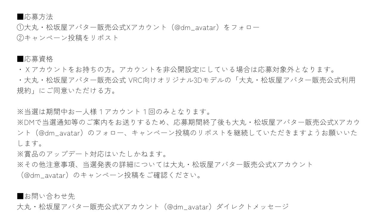 バーチャルマーケット2023 Winter開催期間中、大丸・松坂屋アバター販売公式オリジナルアバター5体を、大丸・松坂屋アバター販売公式Xアカウント(@dm_avatar)をフォローし、キャンペーン投稿をリポストしていただいた方の中から抽選で各1名様、計5名様にプレゼントいたします。