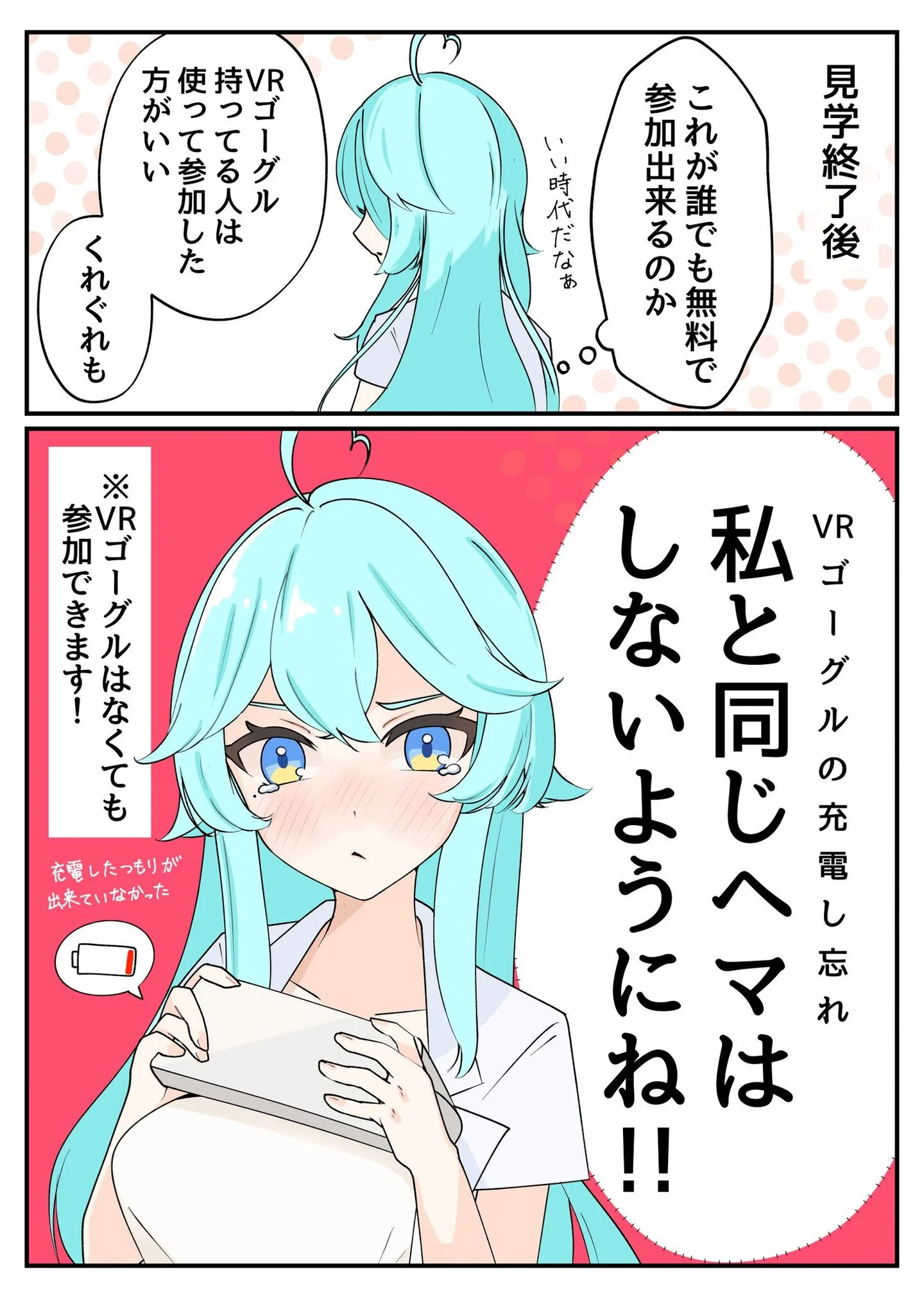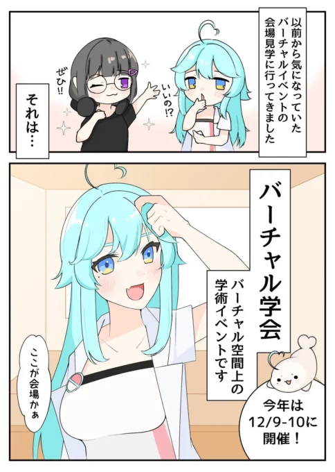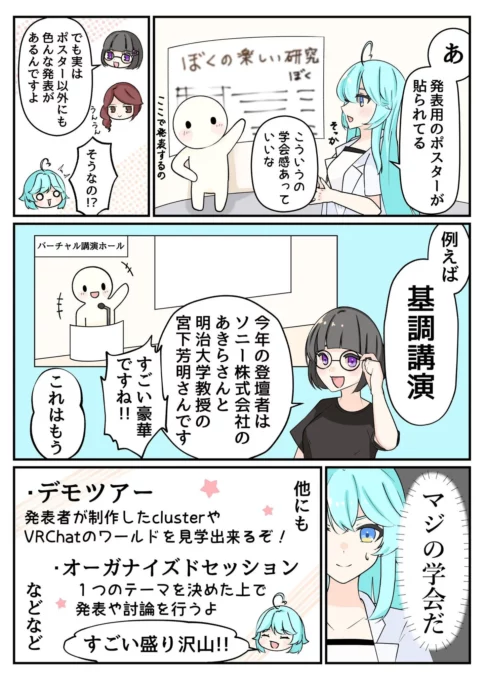 バーチャル学会をより多くの方に体験していただきたいということで、実際にバーチャル学会の会場見学の様子をメンタル薬学系Vtuber 兼 イラストレーターの「雨声シト」氏にレポート漫画として描いていただきました。