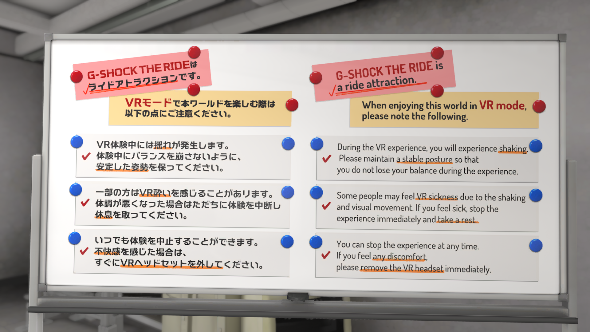 なお、VRに慣れていない方はホワイトボードに注意事項などがあるため、そちらを見てからアトラクションに参加すると良いだろう。