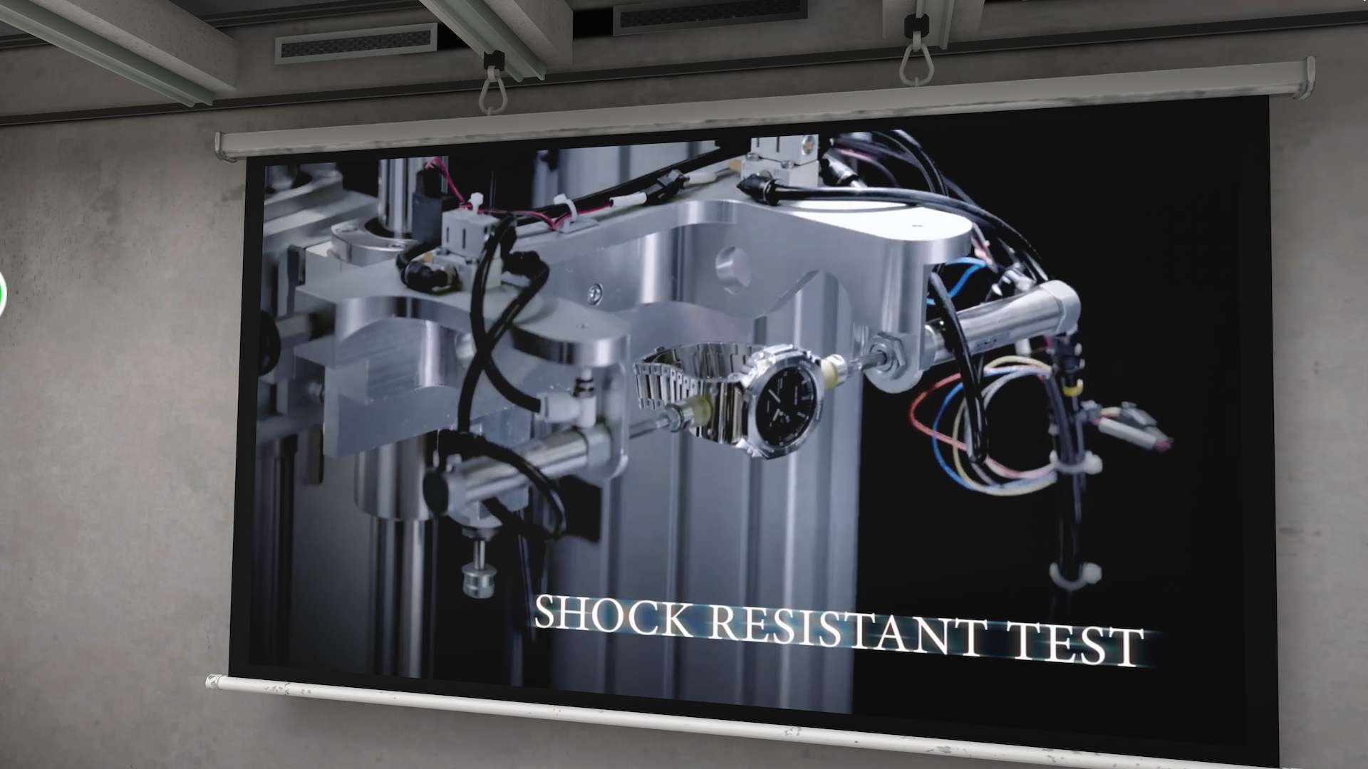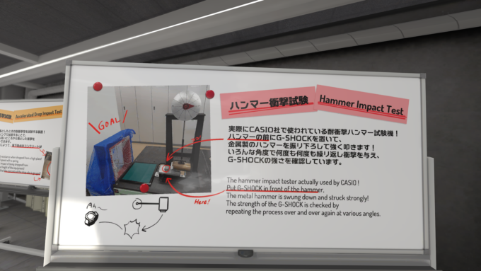 大岩のゾーンを抜けると、衝撃試験として実際に行われているハンマー衝撃試験機が見えてくる。自分よりも何倍も大きいハンマーがぶつかってくるとなると、いくらVRとわかっていても少し怖くて身構えてしまったが、「歴代のG-SHOCKは全てこれを耐えてきました!」という力強い言葉が聞こえてくる。巨大なハンマーがぶつかってくるように感じるが、G-SHOCKのサイズ感覚で言うと実際のサイズ感そのものとも言えるため、G-SHOCKがいかに強靭な衝撃耐性を誇るか体感できる気がした。
