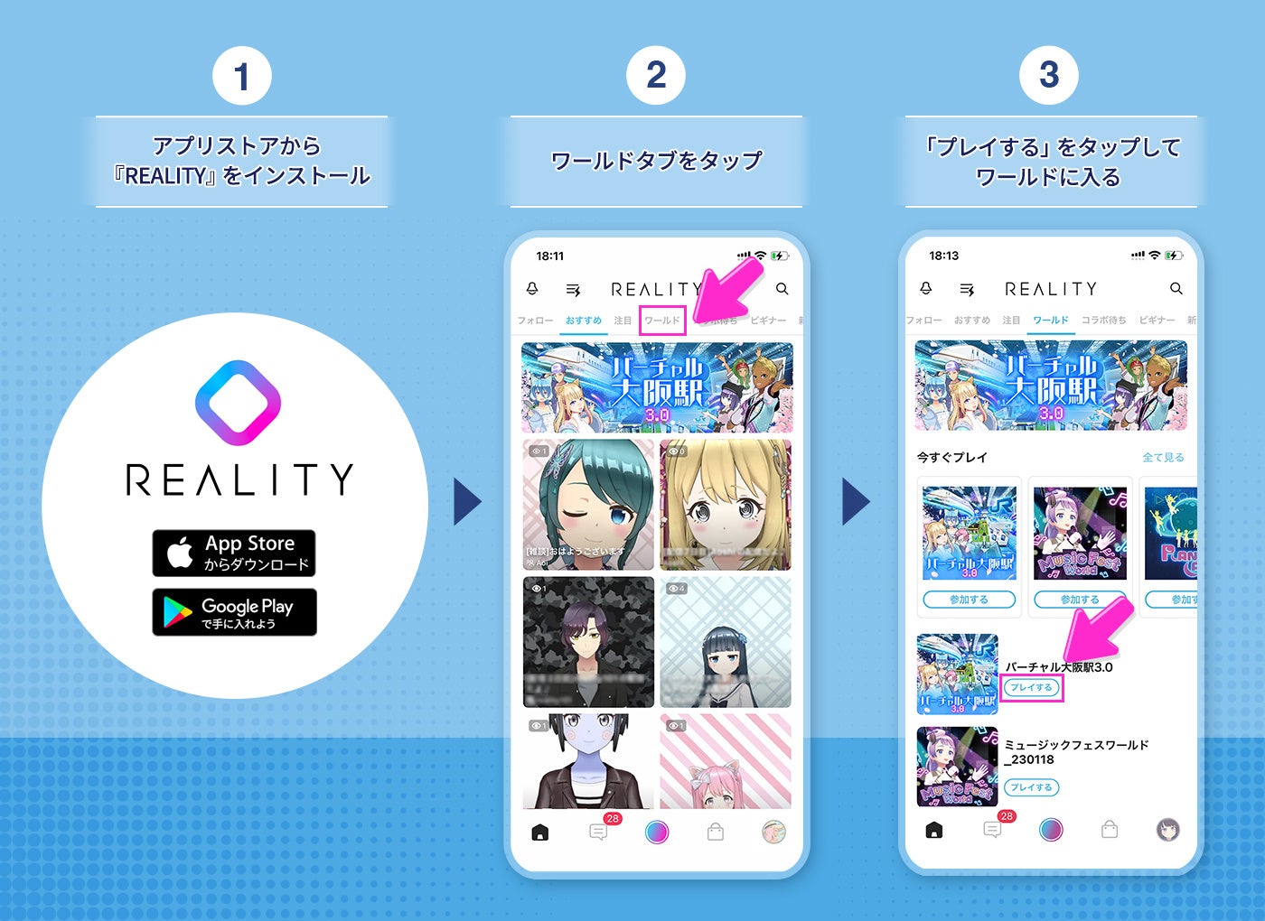参加方法:利用されるスマートフォンへアプリ「REALITY」のインストールと無料アカウント(アバター)作成が必要です。アプリ内の「ワールド」タブに表示されている「バーチャル大阪駅 3.0」を選択しご参加ください。