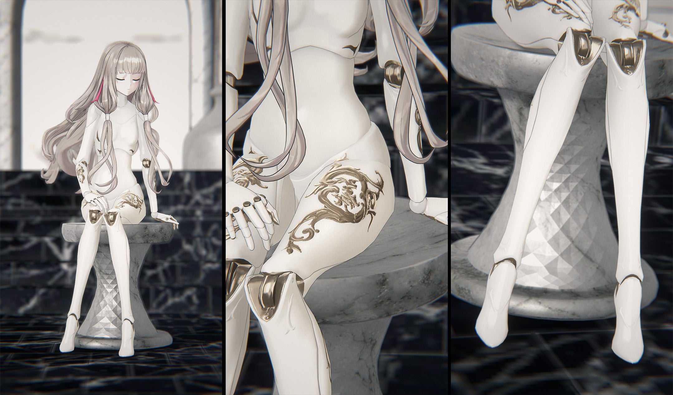 素体には通常のYM Bodyと異なる「人形素体」を採用。 既存のWomen Lサイズの3D服飾モデルを着用できる互換性を保ちながら「ヒト回帰」独自のデザインで展開いたします。