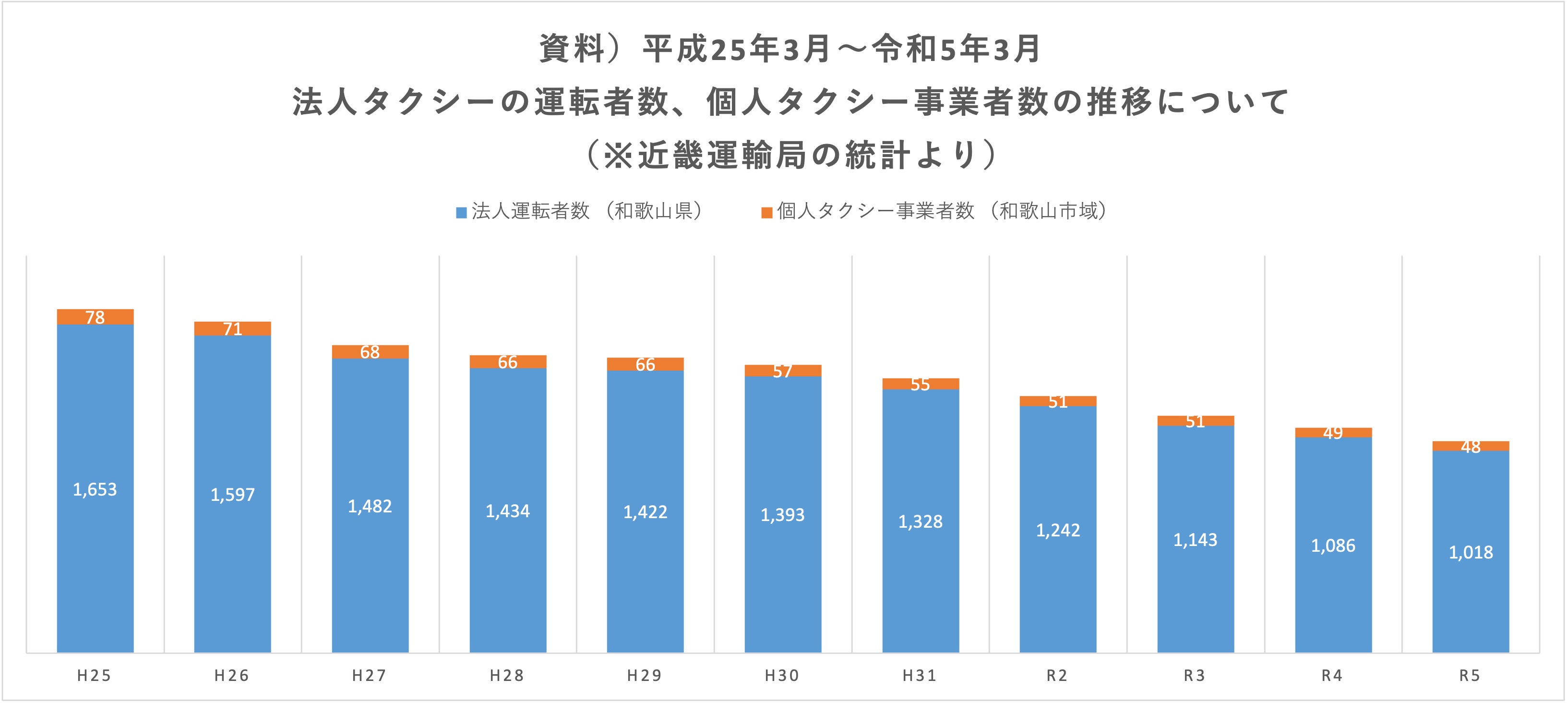 近畿運輸局によると、和歌山県の法人タクシーの運転者数は、平成25年の1653人から、令和5年の1018人と10年間で約40%減少しました。