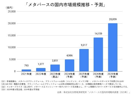 株式会社矢野経済研究所「メタバースの国内市場動向調査(2023年)」(2023/08/30 発表)によると、日本のメタバース市場(メタバースプラットフォーム、プラットフォーム以外(コンテンツ、インフラ等)、XR(VR、AR、MR)機器の合計)は、2022年度に1,377億円(前年度比73.6%増)となり 2026年度には約1兆42億円まで拡大すると予測されています。