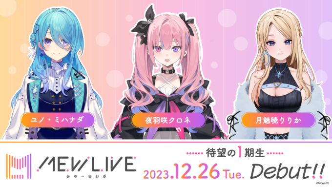 バンダイナムコミュージックライブは22日、VTuber事務所「MEWLIVE」(みゅ~らいぶ)の1期生として、夜羽咲クロネ、ユノ・ミハナダさん、月魅暁りりかさんの3名が12月26日にデビューすることを発表した。同日21時よりリレー配信を行う。
