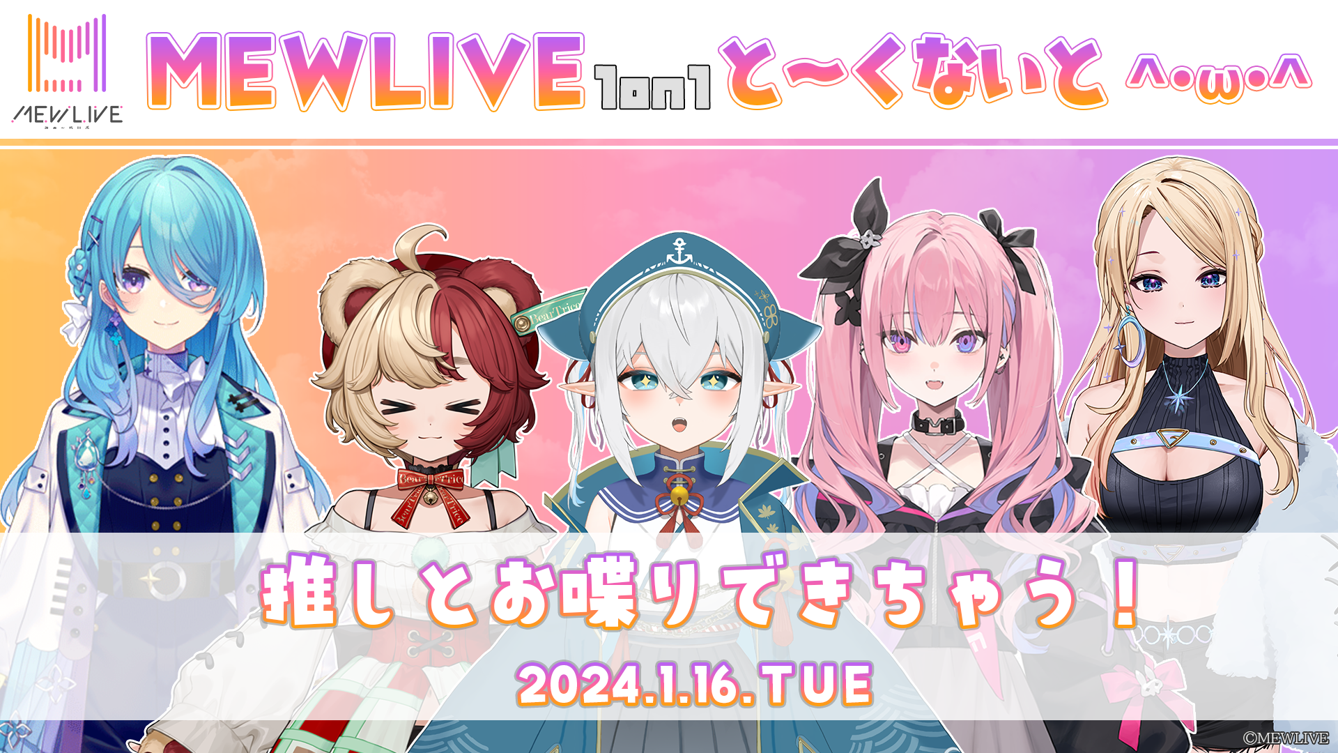 同時に、0期生の我王むすびさん、熊乃ベアトリーチェさんと1期生の5人が揃ったオンライン個別トークイベント「MEWLIVE 1on1 と~くないとฅ^•ω•^ฅ」を1月16日に実施することも明らかにした。