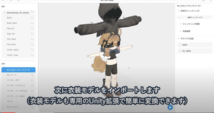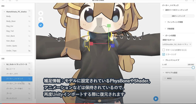 今回の新機能では、UnityのEditor拡張を利用することで、VRChat向けのアバターや衣装をVRoid Studioで扱える独自フォーマットに変換。フィッティング機能を使ってアバターの体型に衣装を合わせて、VRChat向けのデータかVRMファイルとして書き出せるようになった。フィッティング時は、以下の機能を用意する。