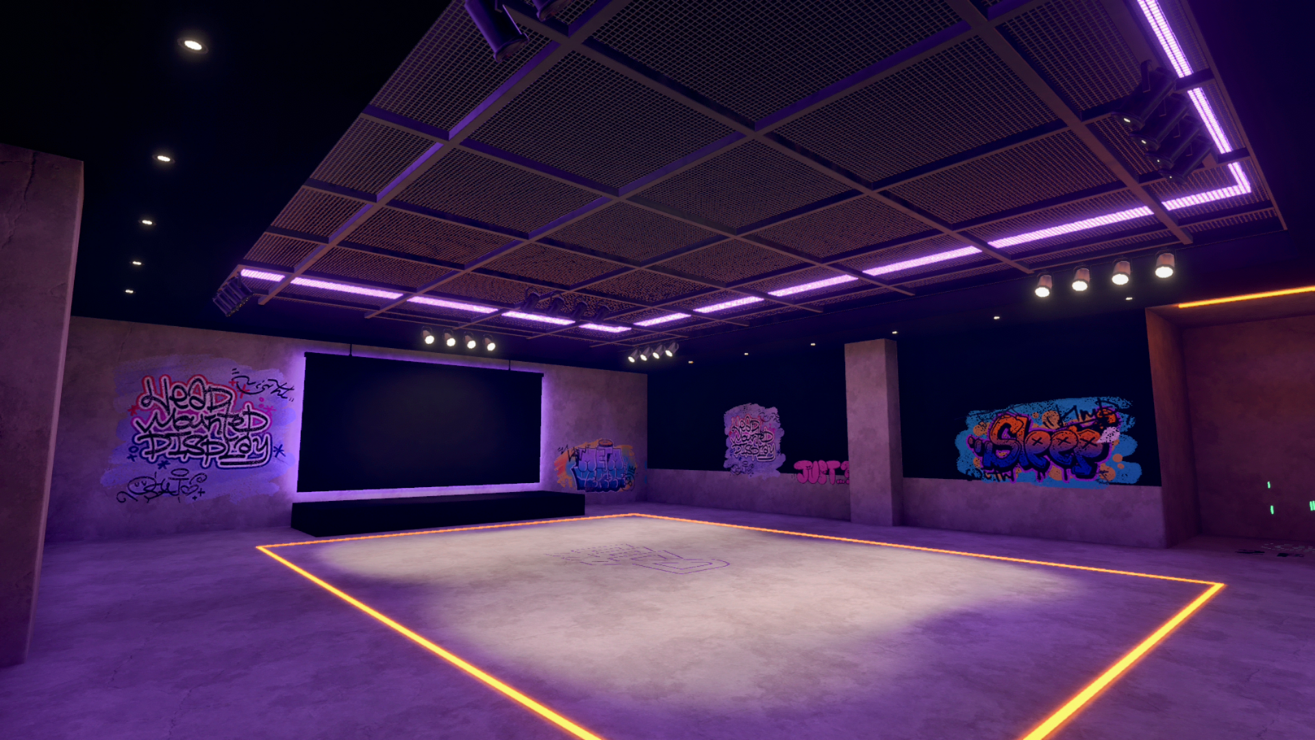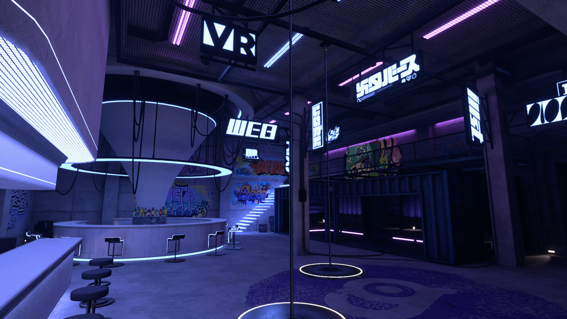 サイバーパンクをテーマにした4階建てのワールド。多目的に利用可能なカフェバーや、動画プレイヤー付きの会議室を備える。
