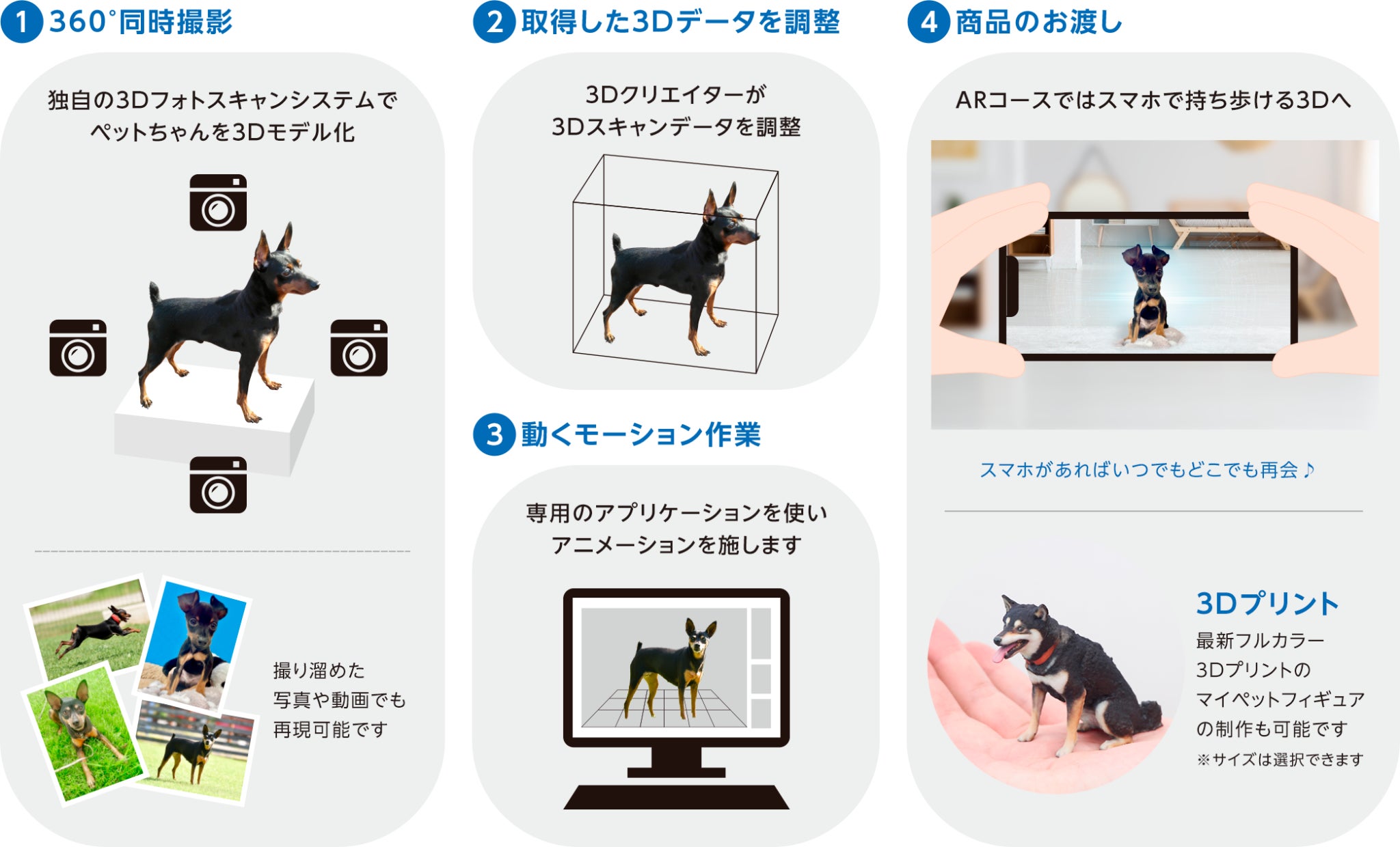 最新の最新のフォトグラメトリー技術で、ペットちゃんの立体データを取得することができ、ARゴーグルを装着すると、ペットちゃんが家の中に現れ、いつものような行動を垣間見れます。オプションとして、特徴的な動き方や鳴き声などを再現することも可能です。