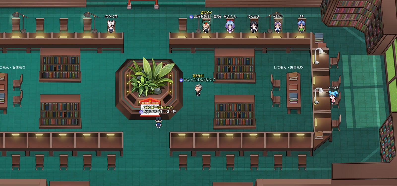 メタバース自習室は、2Dの画面上に表示される仮想世界空間に準備された「まなぶてらすの自習室」で、自分の分身(アバター)をゲームのように操作し「着席」したり、「先生のところまで足を運んだり」しながら、自習を進めていきます。