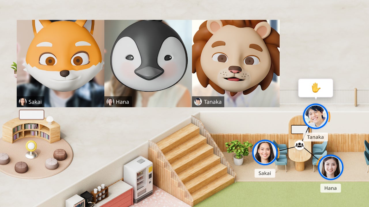 今回、チーム内でのちょっとした会話でより気軽にカメラをオンにしていただけるように、ビデオ通話使用時に動物に変身できるバーチャルアバターを公開しました。ライオン、ペンギン、キツネの3種類から選べ、顔の動きを認識してバーチャルアバターの表情も変わるため、非言語コミュニケーションも促進します。