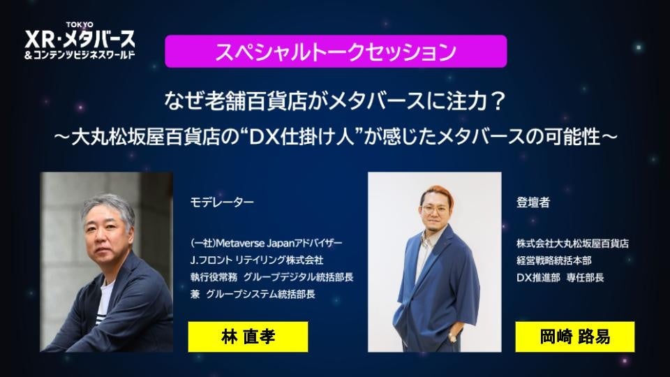 28日にはビジネスステージで行われるステージイベントに、当社のDX推進部 部長 岡崎 路易が登壇します。MVJアドバイザーでJ.フロント リテイリング株式会社 執行役常務 グループデジタル統括部長 兼 グループシステム統括部長の林 直孝とともに、リアル店舗中心の老舗百貨店が、なぜ今「メタバース」に目を向けたのか、アバター販売に乗り出した経緯や、クリエイターエコノミーへの思い、メタバースに感じる可能性について語ります。