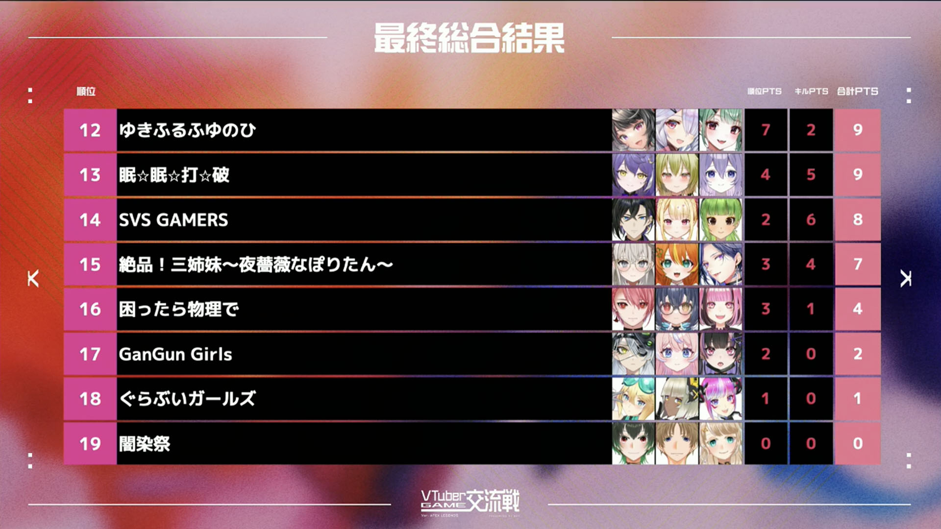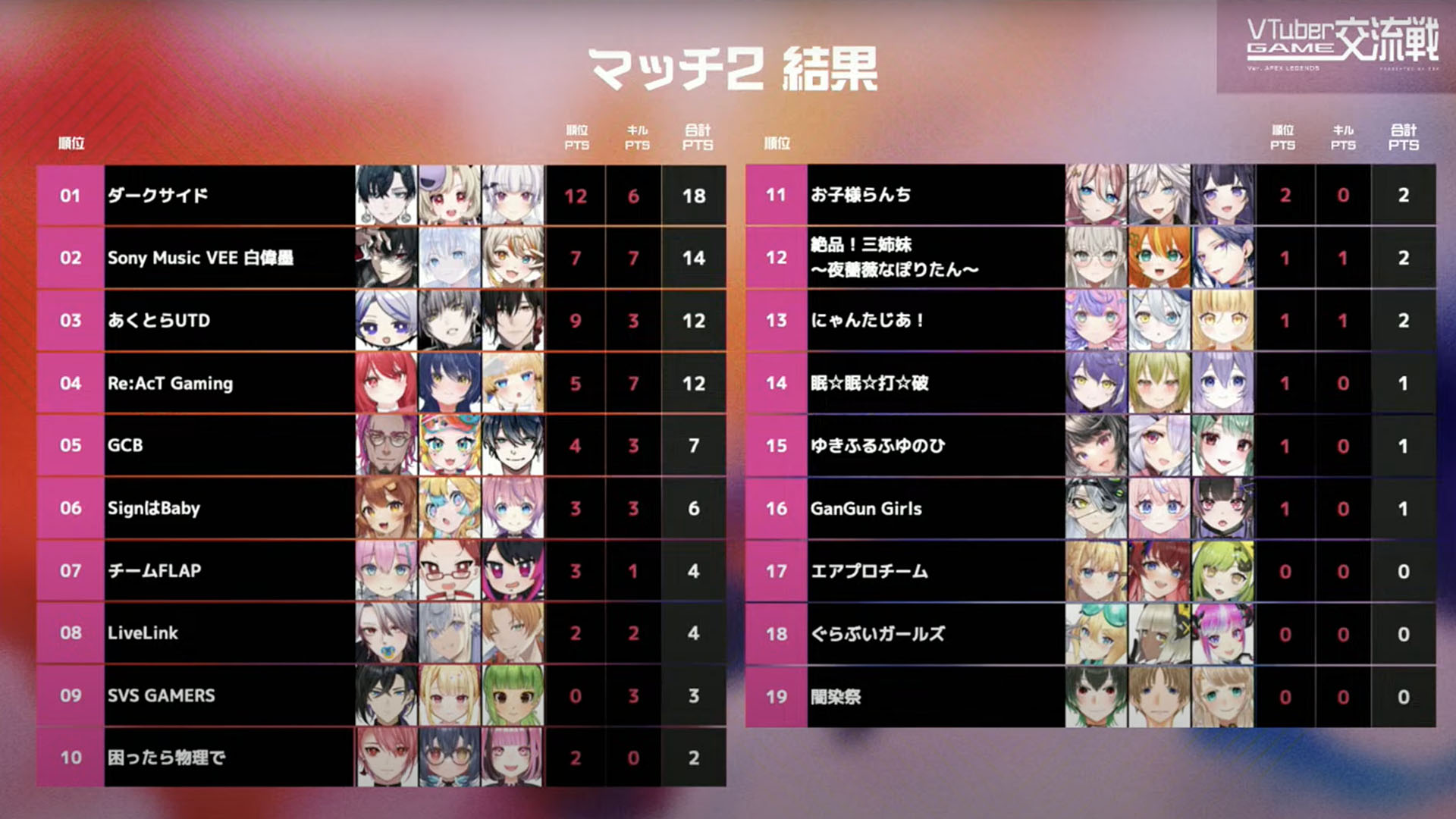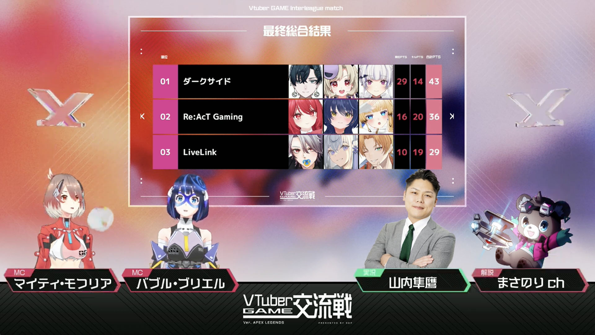 今回の順位は以下の通り。優勝は「星めぐり学園」の「ダークサイド」、2位は「Re:AcT Gaming」の「Re:AcT Gaming」、3位はLiveDuoLinkLoverの連合チーム「LiveLink」となりました。