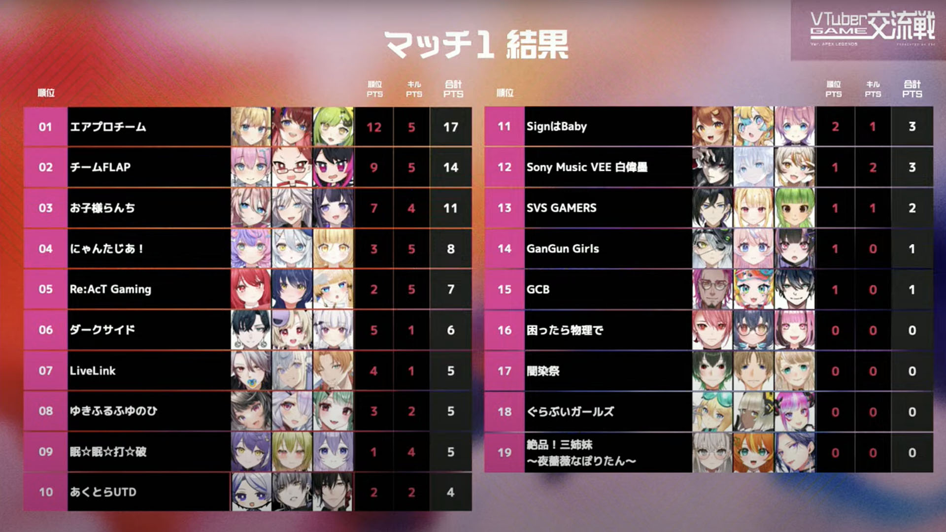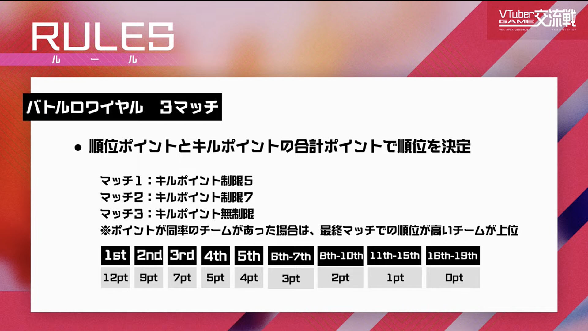 対戦に用いたのはタイトルの通り、3人1組でチームを組み、バトルロイヤル形式で勝ち抜くFPSの「Apex Legends」。ルールは、3マッチを行い、順位とキル数でポイントを加算していき、最終的にポイントが多いチームで順位を決める……ものなのですが、これもタイトル通り勝つことだけが目的ではなく、VTuber事務所同士が交流を深める場としてご用意いたしました。