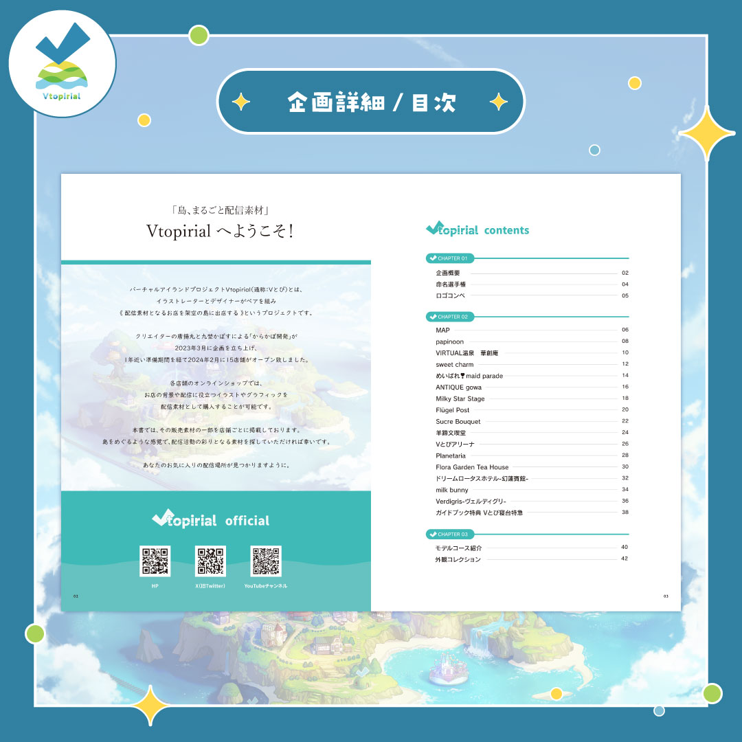 1月26日には、島の外観や店舗情報が掲載された公式ガイドブックも発売。関連グッズも合わせて発表され、いずれも「BOOTH」の 「Vtopirial」 公式ショップにて販売中だ。また、同じく1月26日発売のVTuber専門情報誌「VTuberスタイル」2024年2月号でも、特集記事が組まれているとのこと。気になる方はぜひチェックしていただきたい。