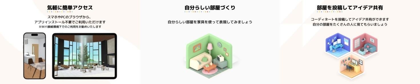 「Tokyo Meta Living」は、ユーザーが間取りや家具を選び、自分好みの部屋をシミュレーションできるだけでなく、他ユーザーにアイデアの共有ができるメタバースです。キーワード検索からイメージに合った他ユーザーの部屋を探すことができるなど、さまざまな形でアイデアを得ることができます。登録無料でPCやスマートフォンなどのWEBブラウザから誰でもアクセスすることができます。