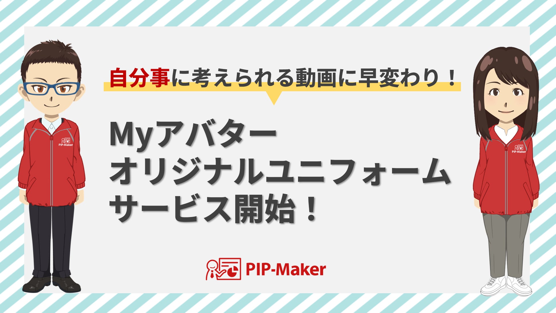 「Myアバターオリジナルユニフォーム」は、『PIP-Maker』(ピーアイピーメーカー)で作成したアバターのオリジナルユニフォームを制作するサービスです。動画上のアバターに自社のユニフォームを着せることで、動画の内容の信頼性を高め、社員の会社に対するエンゲージメントの向上などを実現します。