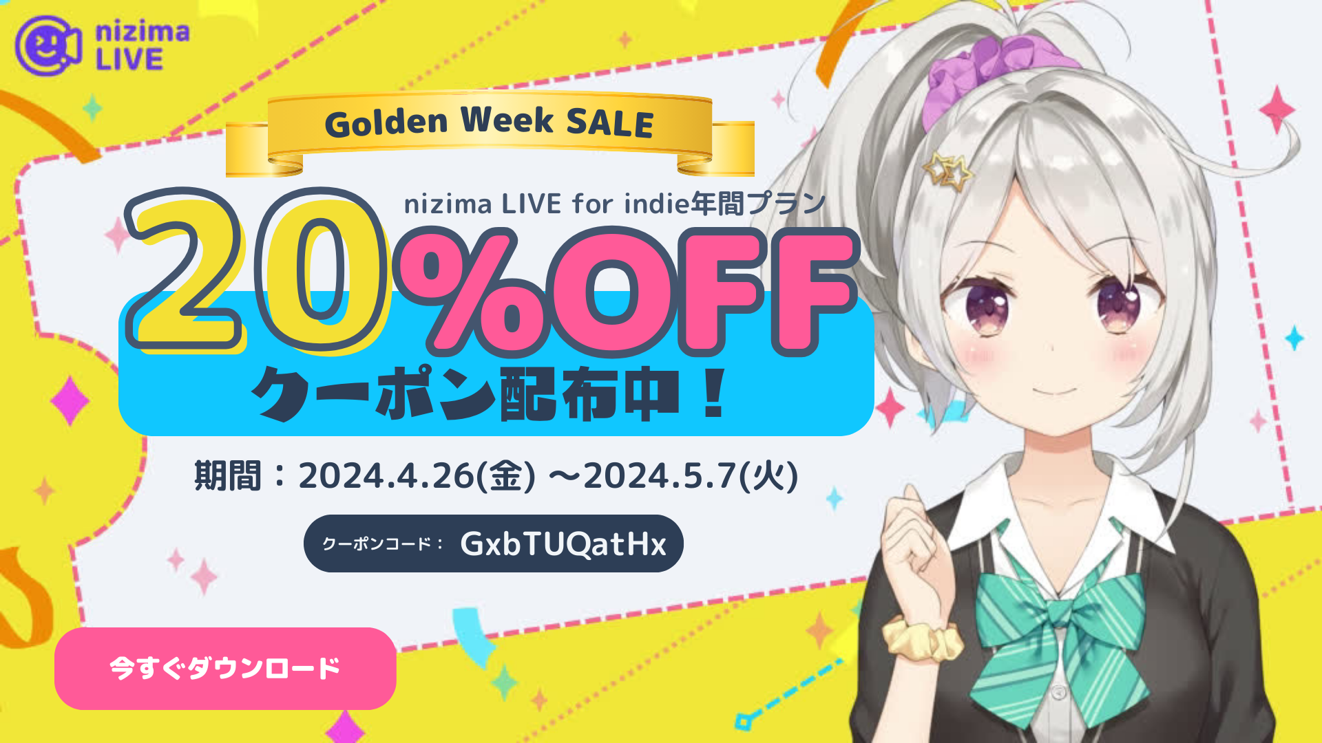 「nizima LIVE Indie 年間プラン」も20%OFFでご購入頂けるクーポンを配布します。Live2D Cubism PROとnizima LIVEをセットでお得にはじめるチャンス!