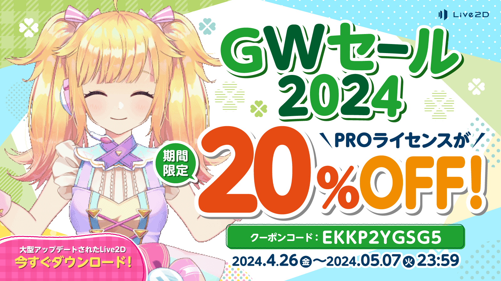 2024年4月26日(金)~2024年5月7日(火)の12日間限定で『Live2D Cubism PRO ライセンス』が20%OFFでご購入頂けるクーポンを配布します!