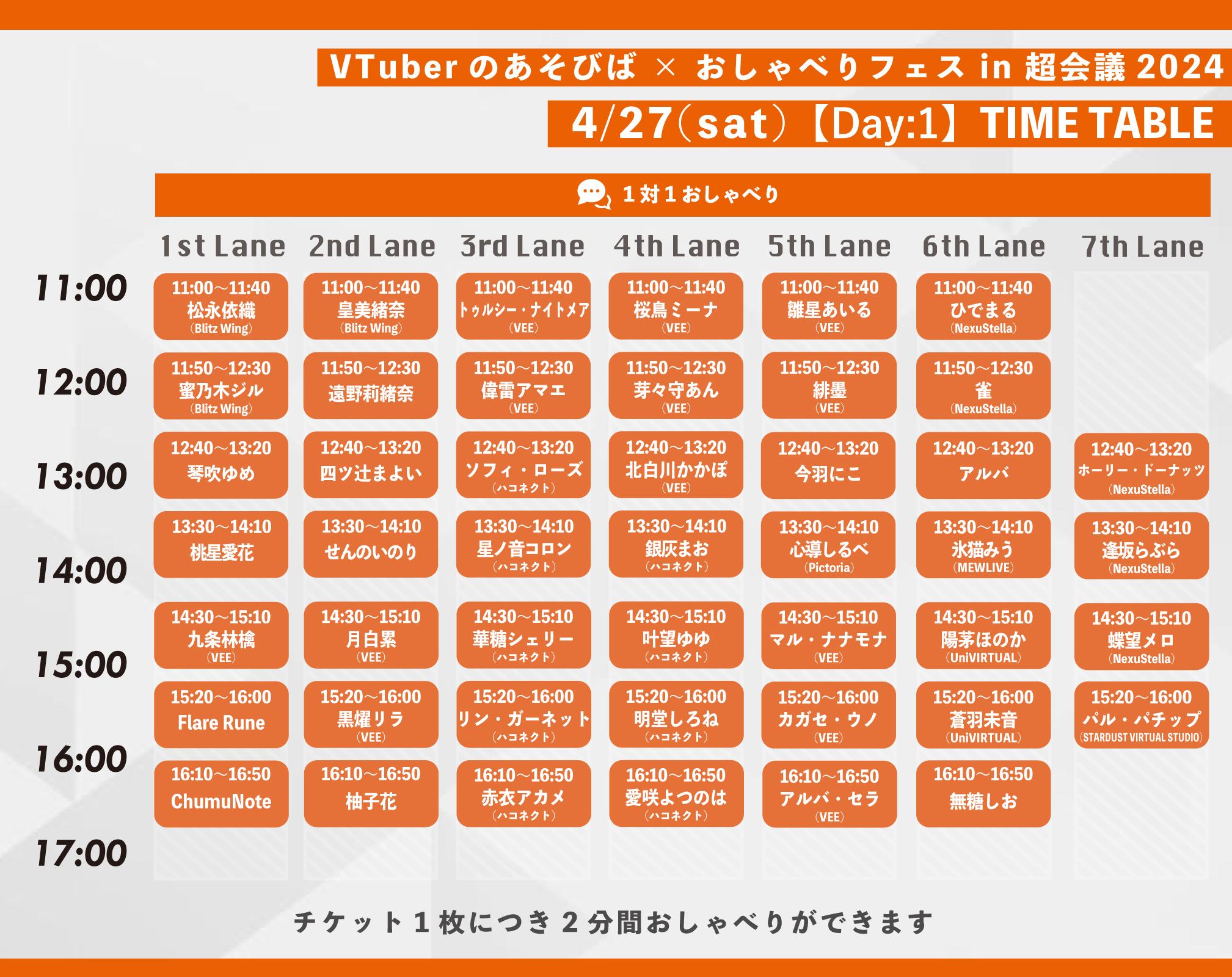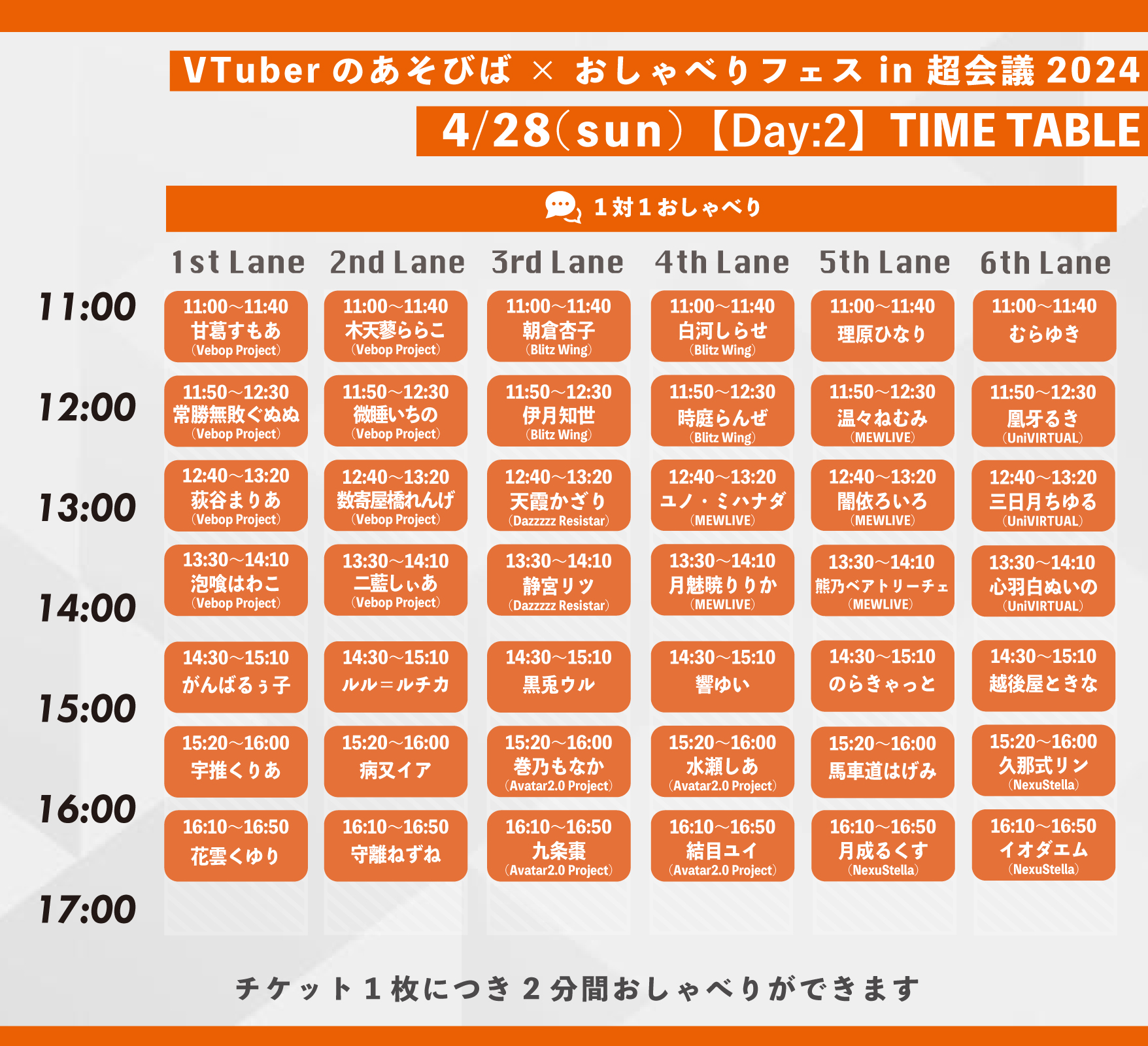 40分入れ替えで、1日7枠2レーン、合計28名のVTuberさんにご出演いただいております。ビデオゲームでも、アナログゲームでも、誰かと話しながら遊べるのはめちゃくちゃ楽しいことです。「1対1だと緊張しちゃう」という方にも、ぜひ体験してほしいです。