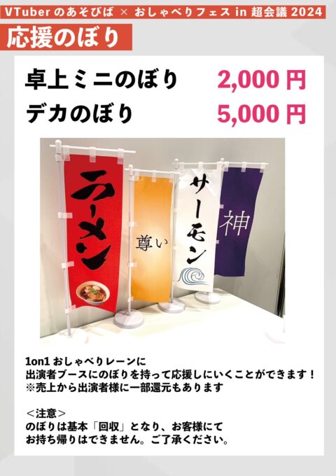 さらにおしゃべりフェスでは、「応援のぼり」という独自のシステムを用意しています。会場の物販で「尊い」や「神」などと書かれたのぼりをレンタルして、物理で気持ちを伝えられます(中には「ラーメン」や「サーモン」など、謎ののぼりもありますが……)。