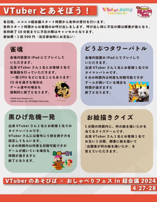 今回からの新企画で、1回500円の現地払いで下記ゲームをVTuberさんと遊ぶことができます。