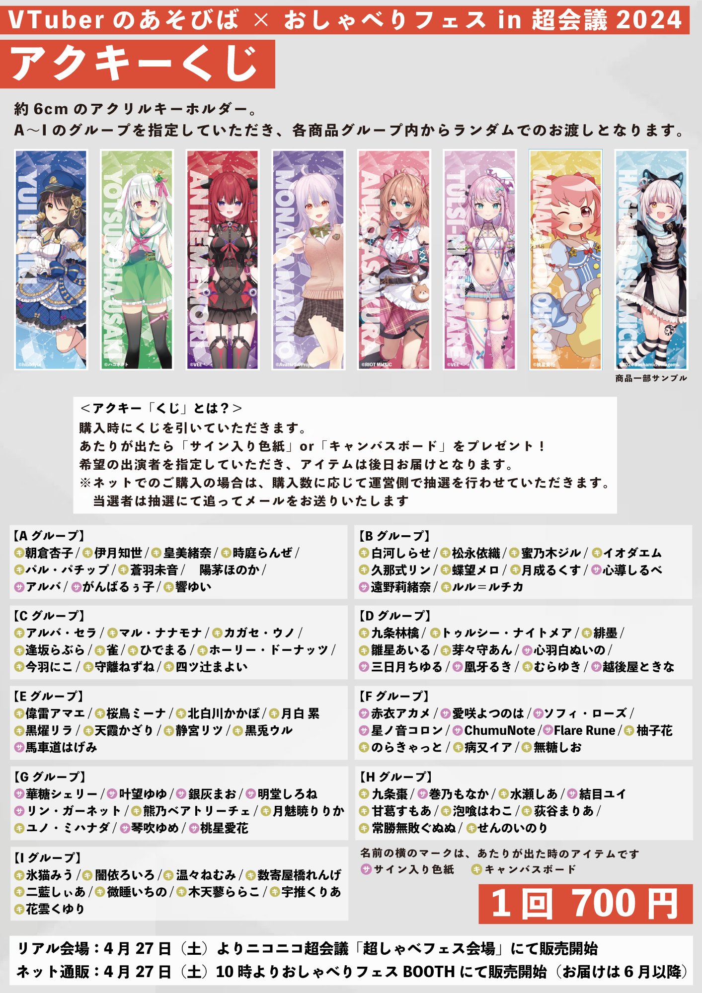 今回は、アクキーくじ、ブロマイド、タペストリーの3種類をご用意。アクキーとブロマイドはいくつかのグループに分けてのランダムとなります。場所は、おしゃべりフェスのブース内のほか、BOOTHでもネット販売します(超物販ブースでの販売はありません)。